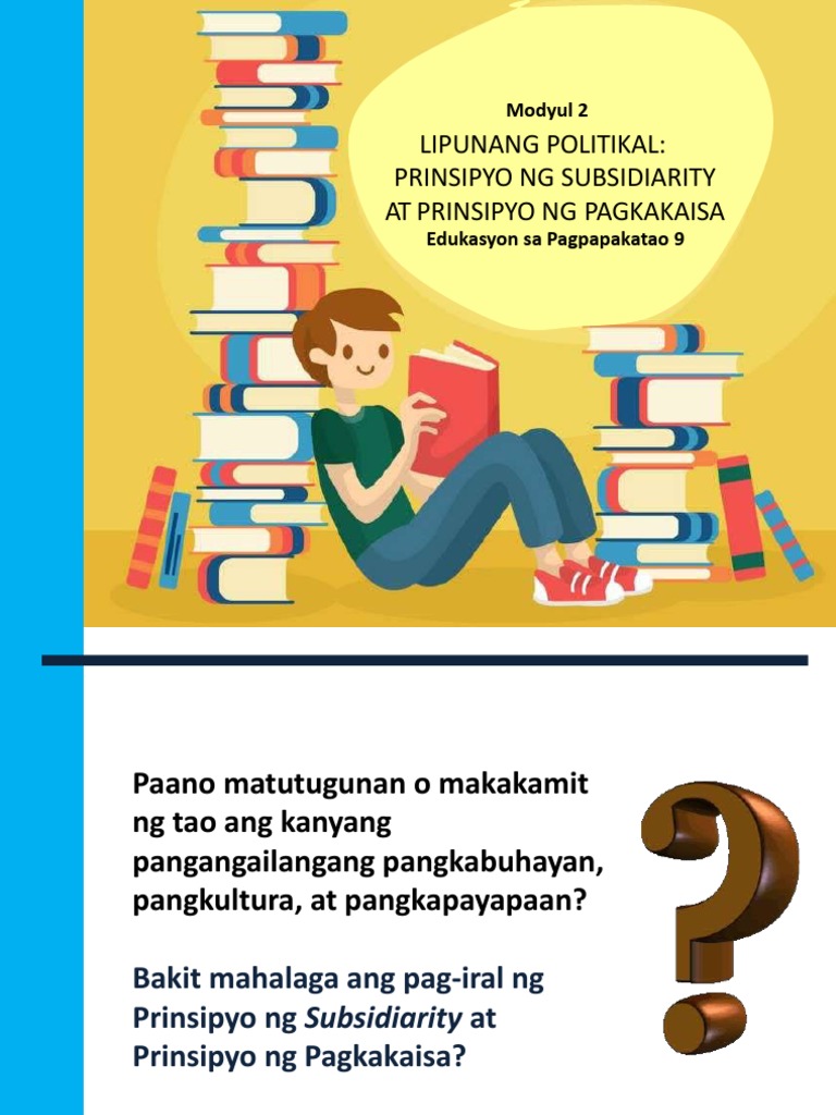 Prinsipyo ng Pagkakaisa 22 Natataya ang pag-iral o kawalan sa pamilya paaralan barangay pamayanan o lipunanbansa ng a Prinsipyo ng Subsidiarity b Prinsipyo ng Pagkakaisa 4. Ang mga isyung political ay isa sa mga bagay na nangangailanan ng mabili na aksyn. Mawawalang saysay din ang prinsipyo ng solidarity at subsidiarity kung hindi rin matatag ang samahanng magkakapitbahayan.
